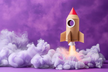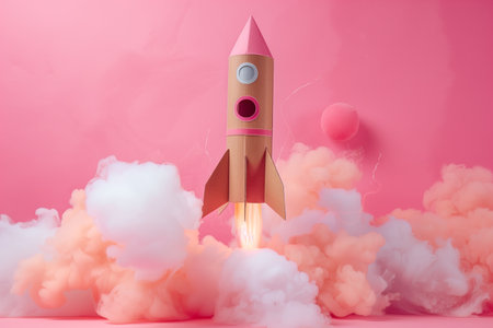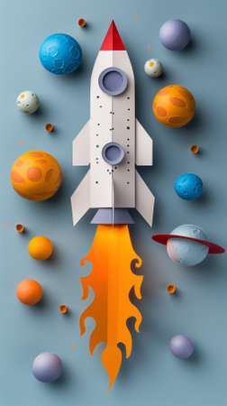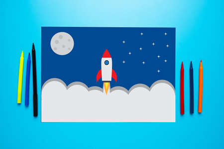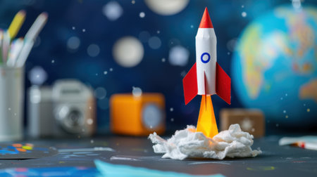 This vibrant image showcases a charming paper rocket launching from a cloud atop a table, surrounded by colorful elements depicting a playful space theme.