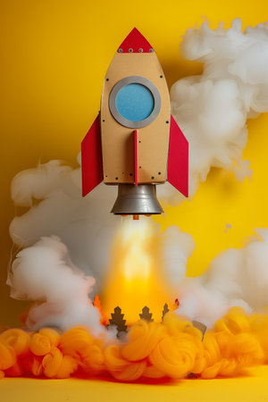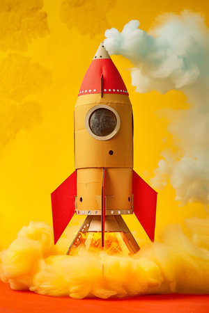 Childrens cardboard rocket on a yellow background with launching smoke and copy space. High quality photo