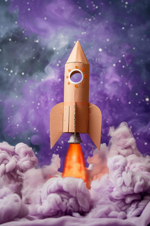 Colorful clay rocket launching into the starry sky