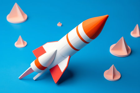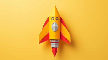 A vibrant rocket model rests against a striking orange backdrop, ideal for projects in education, technology, and creative design.