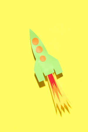 green paper rocket on yellow background
