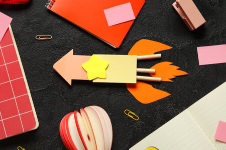 Paper rocket with paper clips and different stationery on black background. Top view