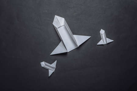Origami space rockets shuttles on black background. minimalism. top view