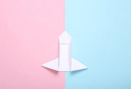 Origami space rocket shuttle on blue-pink pastel background. minimalism. startup. top view