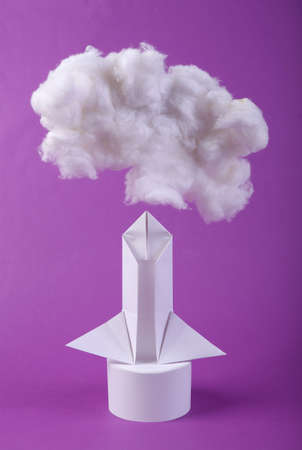 Space origami shuttle and cloud on purple background. Startup, dream concept. Conquest of space. creative ideas