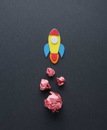 Launching paper rocket with jet stream of paper balls, creativity concept or new ideas metaphor, start up business, new year's resolution