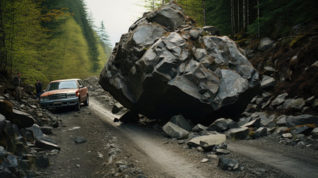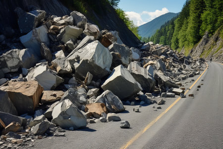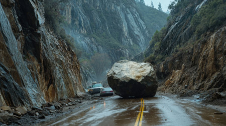 massive boulders blocking mountain road post-mudslide, created with generative ai