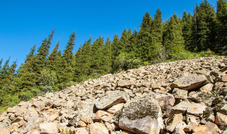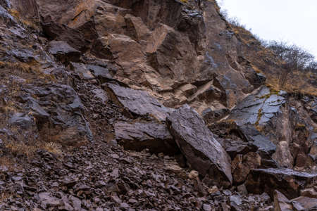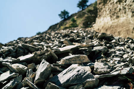 Close up of stones in highlands. Destroyed rock formations in mountainous area on sunny day.