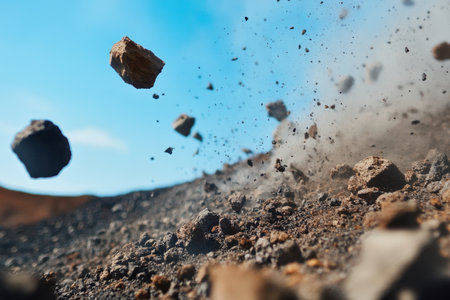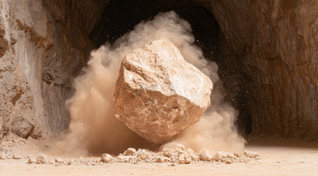 A captivating image capturing the dynamic action of crushed stones falling amidst a cloud of dust in a construction zone, highlighting the energy and disruption involved.