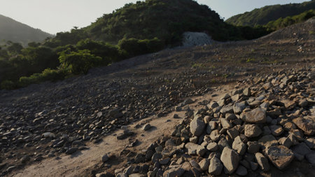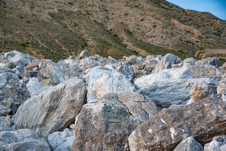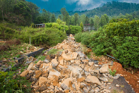 Rocks laid down to construct foundation for the new road in hilly region. Construction work in mountain area.