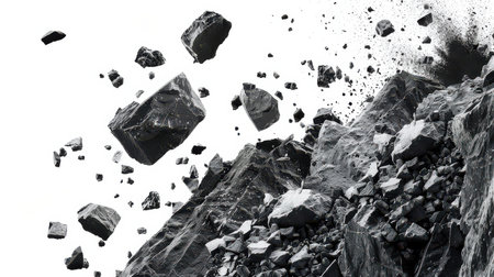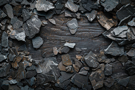 Jagged dark rock debris scattered unevenly over a smooth slate background for industrial textures