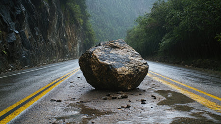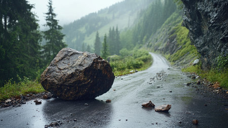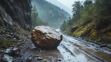 An imposing boulder blocks a road amidst heavy rain, creating a dramatic scene in a lush mountainous landscape, emphasizing nature's power and beauty.