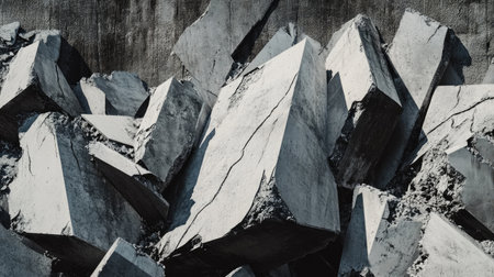 Detailed close-up of broken cement chunks scattered in a line, emphasizing sharp, uneven edges on a construction site