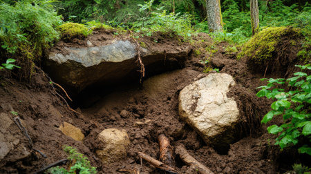 Fallen rocks, dirt, and broken tree roots forming a natural landslide debris background.
