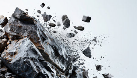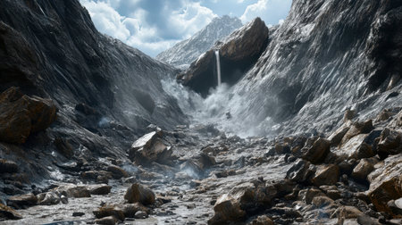 A dramatic rock slide in a mountain range, with loose boulders and debris creating a chaotic scene.