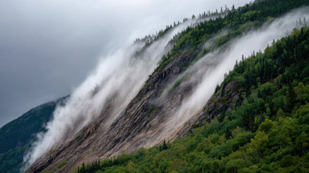A breathtaking view of a rocky mountain slope enveloped in mist, with lush greenery and towering trees under a cloudy sky, capturing the essence of nature