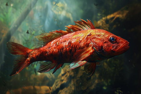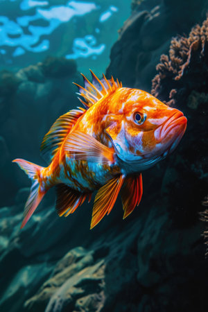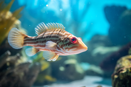 This striking image showcases a colorful fish swimming gracefully in its underwater habitat, revealing intricate details and vibrant colors, enhancing marine beauty.