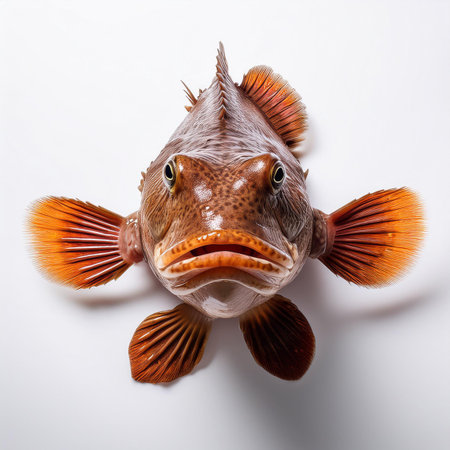 a fish on a white background, captured with the lensbaby composer pro ii and edge 50 optic. the photo showcases a dolly kei-inspired aesthetic with hints of light maroon and gold. the image exudes an unpolished authenticity, combining elements of meatpunk and sharpprickly styles. the intricate and detailed anatomy of the fish is prominently displayed. ai generated