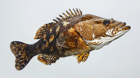 grouper from the Epinephelinae family displays its vibrant colors and unique patterns while swimming against a plain white backdrop highlighting its beauty.