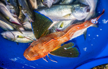 A unique and tasty red gurnard fish with striking winged fins and tentacle like sensory rays at a bustling fish market in Istanbul, Turkey