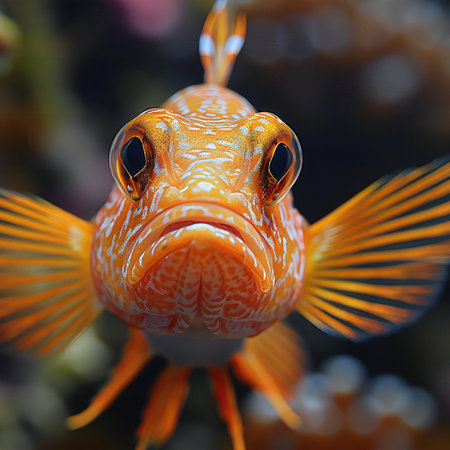 A vibrant orange fish with intricate markings swims towards the viewer, its mouth slightly open as it navigates its aquatic environment.