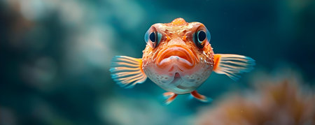 This mesmerizing image showcases a vibrant orange fish gracefully swimming in clear water. The intricate details of its scales and unique expression highlight the beauty of marine life.