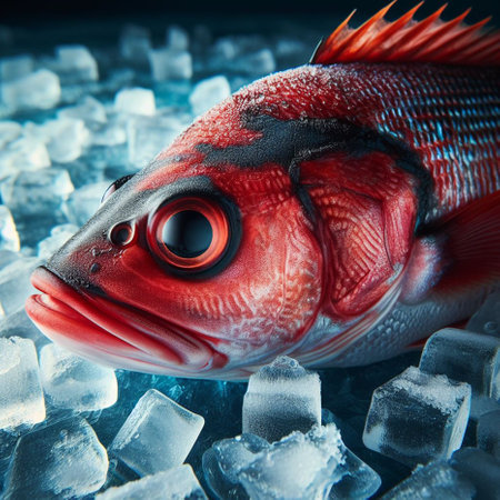 Red fish with ice cubes on a dark background. Close-up.