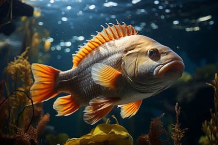 A vibrant fish glides through a sunlit underwater realm, surrounded by lush seaweed and coral. sunbeams filter through the water, the intricate patterns on the fish's scales, creating a serene oceanic landscape. Generative AI