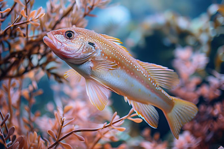 Colorful close-up of a spotted fish swimming among rich aquatic vegetation, showcasing intricate scale patterns and fins. captures the serene beauty of underwater ecosystems and the vibrant life within them. Generative AI