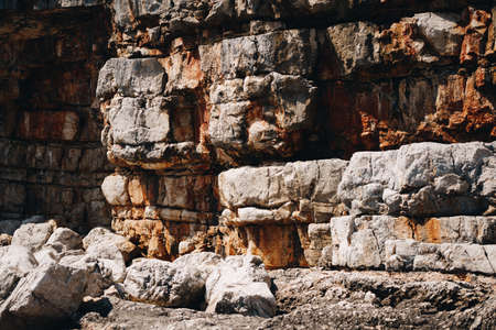 Sea cracked granite textured rock concept photo. Mediterranean sea rough surfaces. Close up stone background for design. Texture in nature for wallpaper. High quality picture for wallpaper