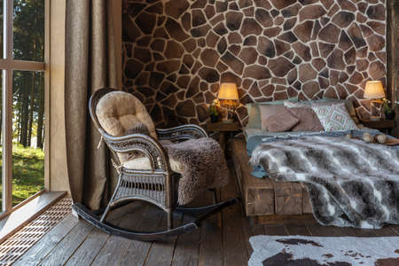 dark cozy interior of big country wooden house, wooden furniture and animal furs. huge panoramic window and very high ceiling.