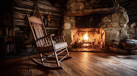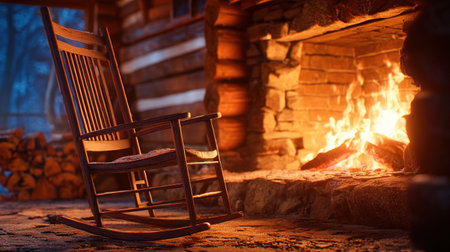 Wooden rocking chair resting on rustic floorboards, bathed in the warm glow of a crackling stone fireplace, creating a cozy and inviting atmosphere inside a log cabin