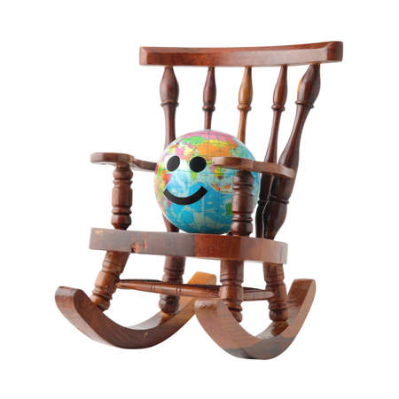 smile world globe rest in wooden rocking chair isolated on white background , environment concept
