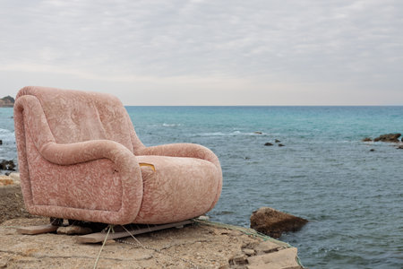 An old armchair on the shore of the beach, surrealistic scenery.