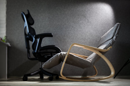 Trendy armchair near shaded spruce wall