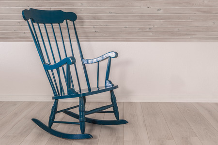 Blue rocking chair on a wooden floor