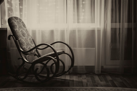 A rocking chair stands by the window in the evening light. Black and white sepia.