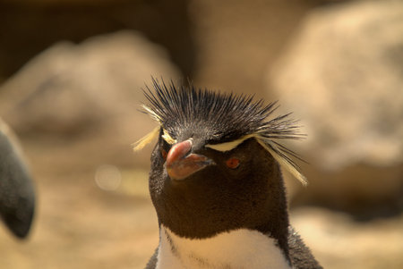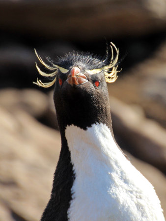 Eudyptes chrysocome is the rock hopper penguin also known as crested penguin living on the rocky and steep cliffs of isla pinguino at the atlantic coast of patagonia in argentina. it is known for its red eyes and characteristic yellow eye brows