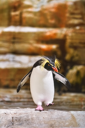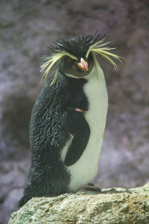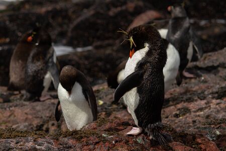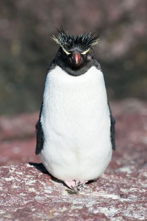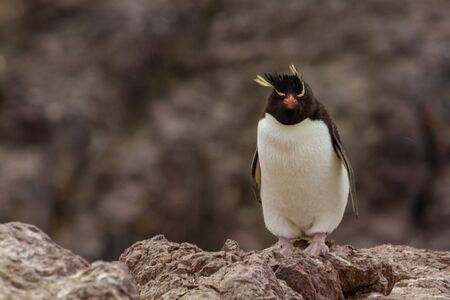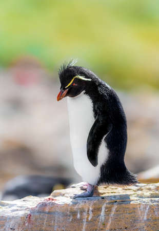 Close up of Southern rockhopper penguin (Eudyptes chrysocome) standing on a rock in Saunders island, Falkland Islands.