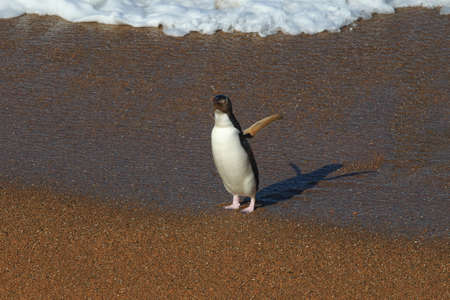 Adult native New Zealand Yellow-eyed Penguin, Megadyptes antipodes or Hoiho, waddling home to nest over rocky shore with surf of South Pacific Ocean in background