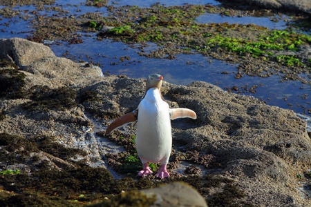 Endagered yellow-eyed penguin (Megadyptes antipodes) seen on rocks at Curio Bay, South Island - New Zealand