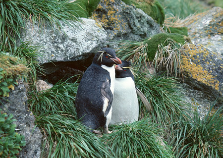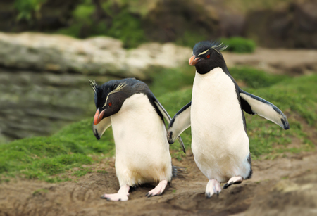 Rockhopper Penguins Eudyptes chrysocome courting on Bleaker Island in the Falkland Islands.