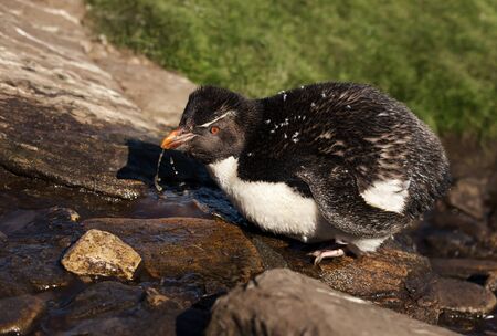 Close up of a Southern rockhopper penguin drinking water from a stream, Falkland islands.