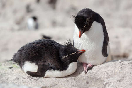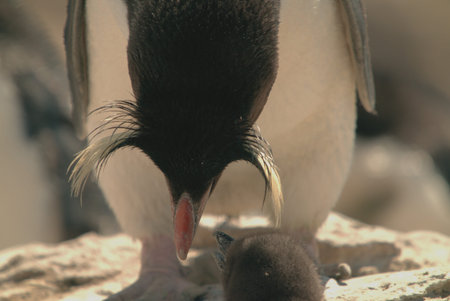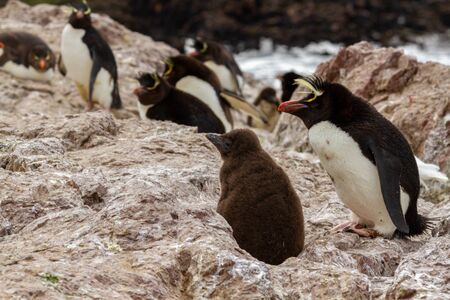 Rockhopper penguin (Eudyptes chrysocome) with chick, Falkland Islands