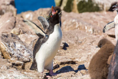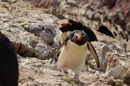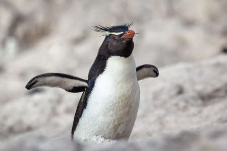 Rockhopper Penguin. This little rockhopper penguin flaps its wings at its colony on West Point Island,