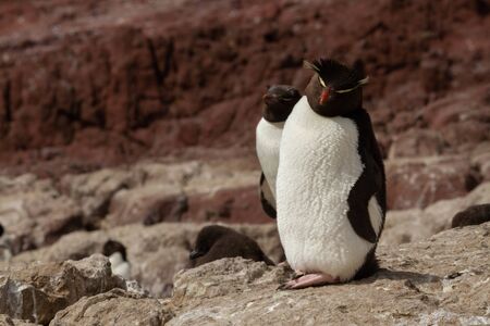 Close up of Rockhopper penguins preening each other, Falkland islands.