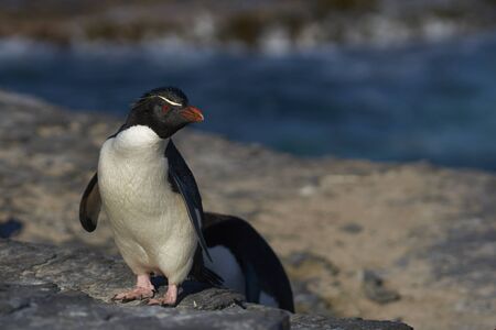Close up of Southern rockhopper penguin (Eudyptes chrysocome) standing on a rock at sunset in Saunders island, Falkland Islands.