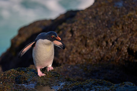 Rockhopper Penguin (Eudyptes chrysocome) coming ashore on the rocky cliffs of Bleaker Island in the Falkland Islands