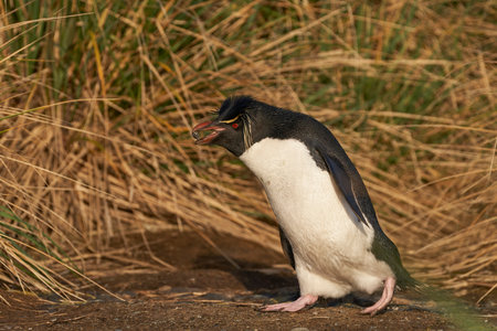 Close up of a Sothern rockhopper penguin (Eudyptes chrysocome) calling, Falkland Islands.
