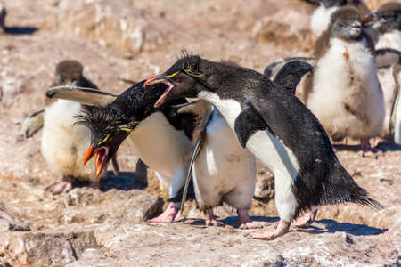Rockhopper penguins fighting over territory, Falkland Islands ( Islas Malvinas)
